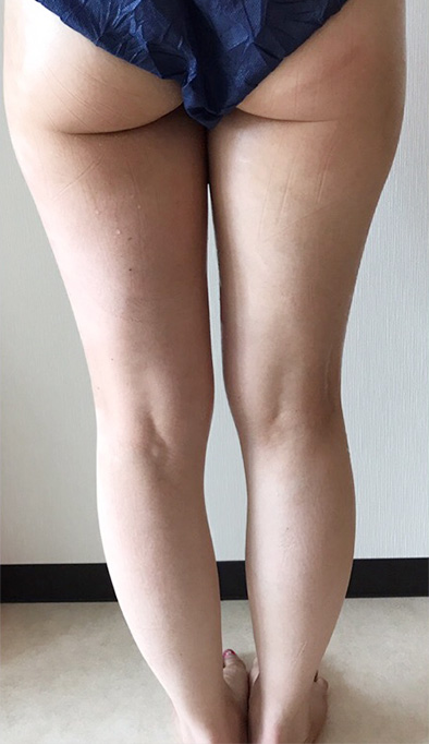 向かって右のみ、スーパーキャビテーションで脂肪を分解・燃焼させたのちラジオ波で老廃物を流す施術を行いました。ラジオ波で徹底的にセルライトにアタックしたのち、脂肪を落とすスーパーキャビテーションで頑固なセルライトもしっかりとほぐしています。併用することで、老廃物が溜まったセルライト脂肪までWでアタックでき、ハンドではケアができなかった表層筋の奥にある深層筋(インナーマッスル)までケアができるため、1度のトライアルでもしっかり効果がでます。さらに筋肉運動ができるEMSとセットでトリプルアタックが可能です。
